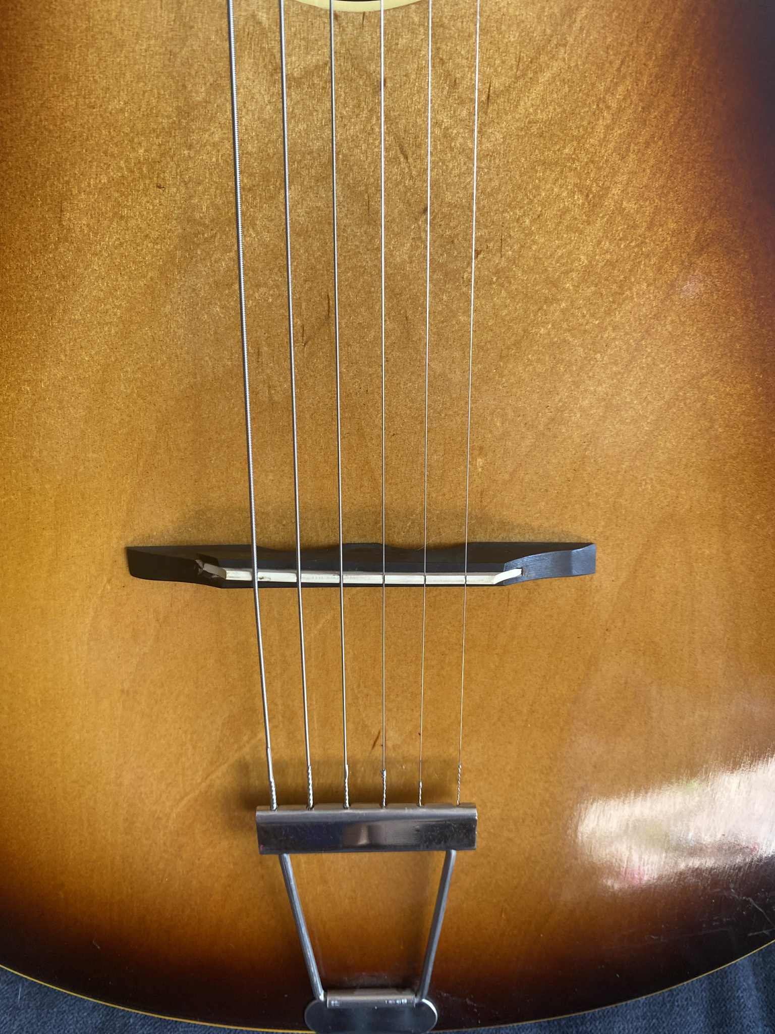 - Floating bridge and Jazz/Gypsy-style tailpiece